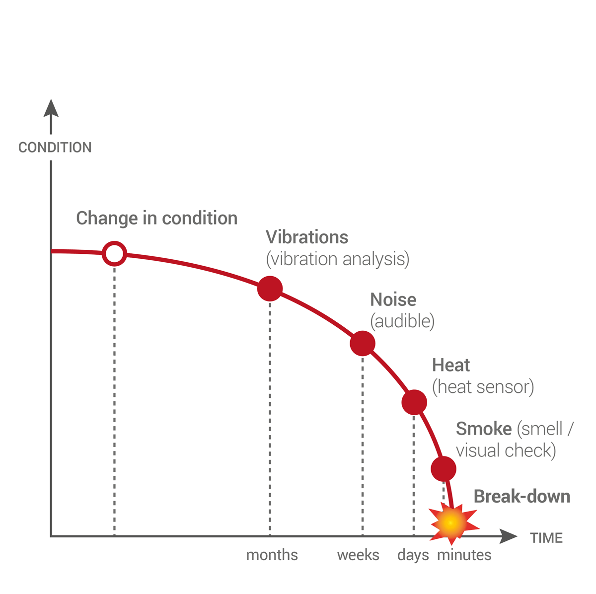 The cost to repair increases drastically the later a failure is detected. Unplanned down-times may be extremely costly, e.g. in coal-mines EUR 100,000+ per hour.